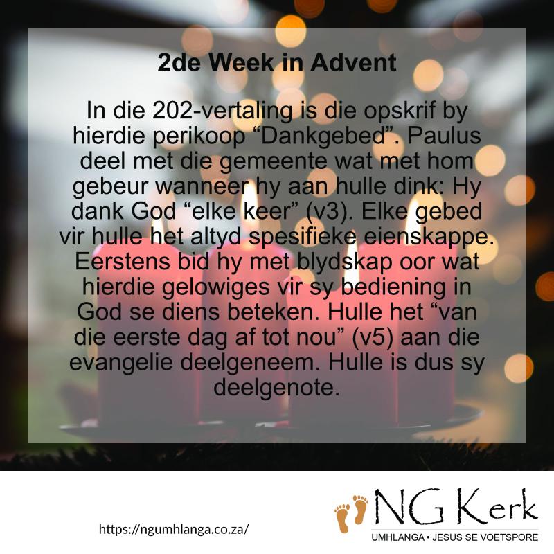 In die 202-vertaling is die opskrif by hierdie perikoop “Dankgebed”. Paulus deel met die gemeente wat met hom gebeur wanneer hy aan hulle dink: Hy dank God “elke keer” (v3). Elke gebed vir hulle het altyd spesifieke eienskappe. Eerstens bid hy met blydskap oor wat hierdie gelowiges vir sy bediening in God se diens beteken. Hulle het “van die eerste dag af tot nou” (v5) aan die evangelie deelgeneem. Hulle is dus sy deelgenote.