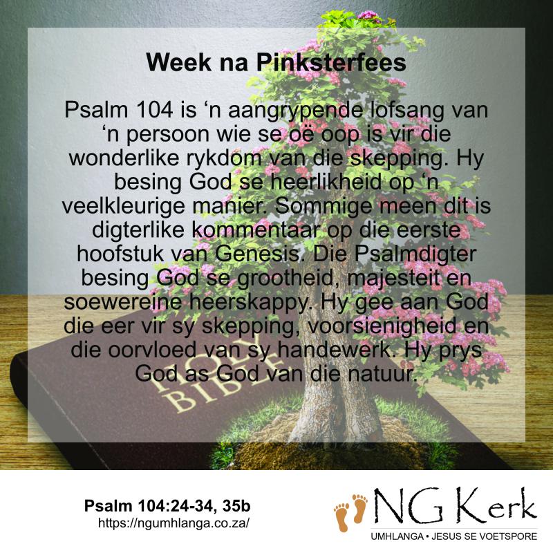 Psalm 104 is ‘n aangrypende lofsang van ‘n persoon wie se oë oop is vir die wonderlike rykdom van die skepping. Hy besing God se heerlikheid op ‘n veelkleurige manier. Sommige meen dit is digterlike kommentaar op die eerste hoofstuk van Genesis. Die Psalmdigter besing God se grootheid, majesteit en soewereine heerskappy. Hy gee aan God die eer vir sy skepping, voorsienigheid en die oorvloed van sy handewerk. Hy prys God as God van die natuur.