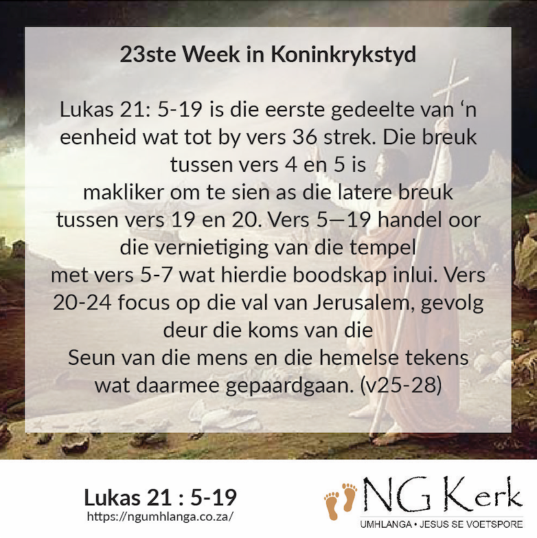 Lukas 21: 5-19 is die eerste gedeelte van ?n eenheid wat tot by vers 36 strek. Die breuk tussen vers 4 en 5 is