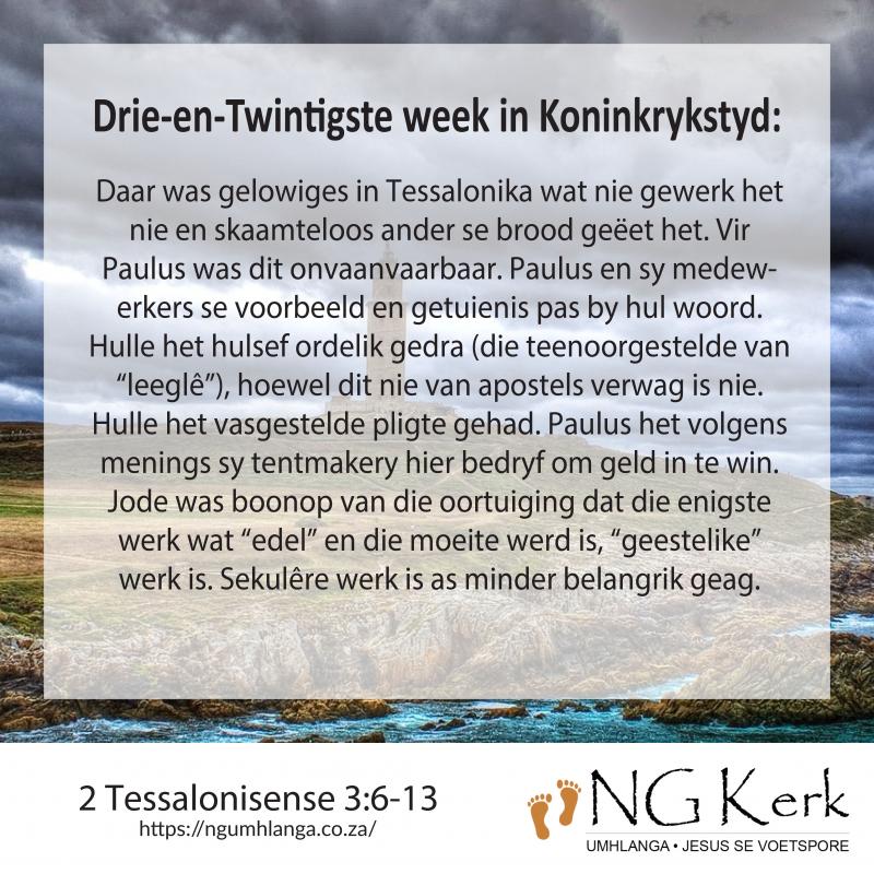 Daar was gelowiges in Tessalonika wat nie gewerk het nie en skaamteloos ander se brood geëet het. Vir Paulus was dit onvaanvaarbaar. Paulus en sy medewerkers se voorbeeld en getuienis pas by hul woord. Hulle het hulsef ordelik gedra (die teenoorgestelde van “leeglê”), hoewel dit nie van apostels verwag is nie. Hulle het vasgestelde pligte gehad. Paulus het volgens menings sy tentmakery hier bedryf om geld in te win. Jode was boonop van die oortuiging dat die enigste werk wat “edel” en die moeite werd is, “geestelike” werk is. Sekulêre werk is as minder belangrik geag.