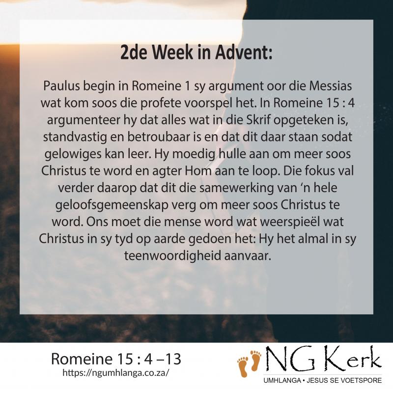 Paulus begin in Romeine 1 sy argument oor die Messias wat kom soos die profete voorspel het. In Romeine 15 : 4 argumenteer hy dat alles wat in die Skrif opgeteken is, standvastig en betroubaar is en dat dit daar staan sodat gelowiges kan leer. Hy moedig hulle aan om meer soos Christus te word en agter Hom aan te loop. Die fokus val verder daarop dat dit die samewerking van ‘n hele geloofsgemeenskap verg om meer soos Christus te word. Ons moet die mense word wat weerspieël wat Christus in sy tyd op aarde gedoen het: Hy het almal in sy teenwoordigheid aanvaar.