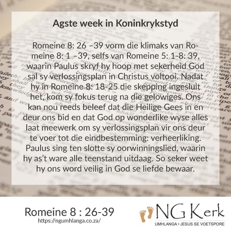 Romeine 8: 26 –39 vorm die klimaks van Romeine 8: 1 –39, selfs van Romeine 5: 1-8: 39, waarin Paulus skryf hy hoop met sekerheid God sal sy verlossingsplan in Christus voltooi. Nadat hy in Romeine 8: 18-25 die skepping ingesluit het, kom sy fokus terug na die gelowiges. Ons kan nou reeds beleef dat die Heilige Gees in en deur ons bid en dat God op wonderlike wyse alles laat meewerk om sy verlossingsplan vir ons deur te voer tot die eindbestemming: verheerliking. Paulus sing ten slotte sy oorwinningslied, waarin hy as’t ware alle teenstand uitdaag. So seker weet hy ons word veilig in God se liefde bewaar.